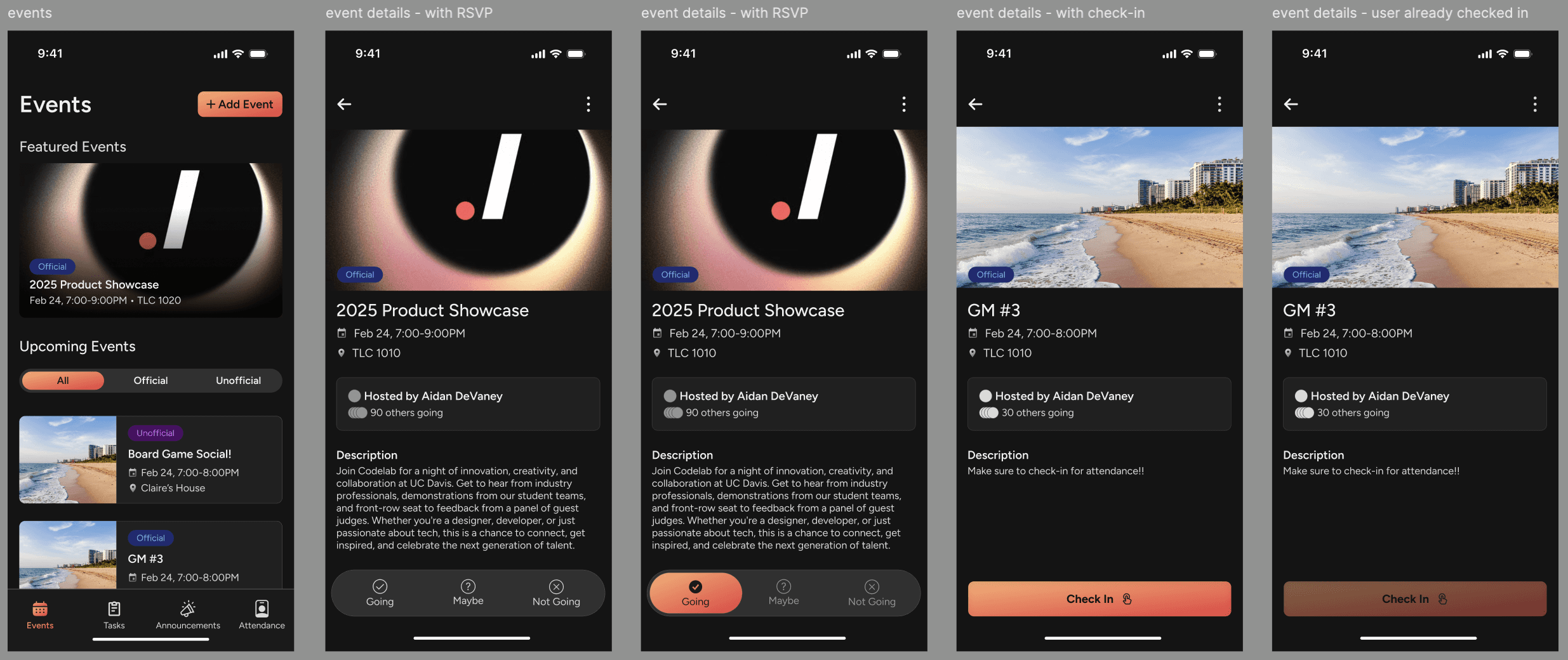 Events Page - event details, RSVPing, and Checking-In