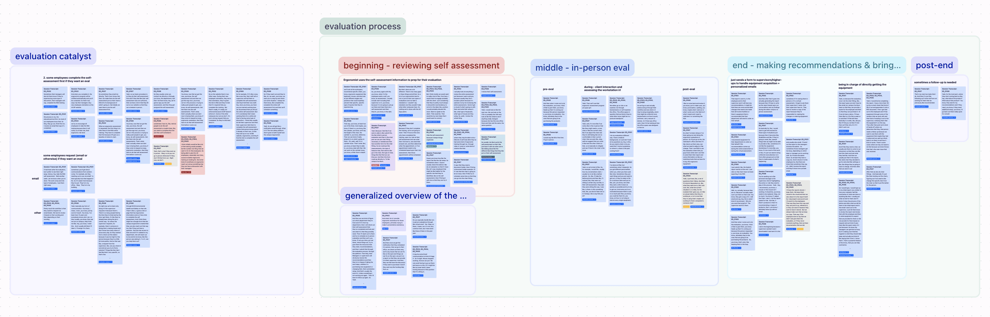 I first reviewed all of the transcripts to map the common steps ergonomists take in their end-to-end process, noting down their Jobs To Be Done (green section). I noted down whenever they were receiving or sending communication (blue section), which painted the picture of when they fall into their main pain point of managing and losing communication with their clients (red stars)