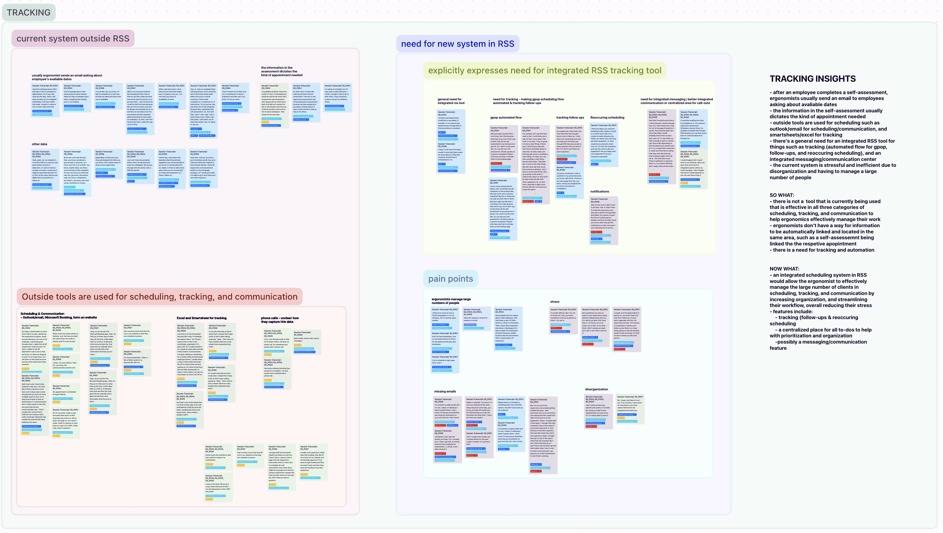 When checking the quote board, I realized that most of the pain points revolved around tracking communication and case progress. Thus, I created a new section in the quote board called "Tracking" where I mapped people's thoughts, focusing on their pain points. I found three main themes.